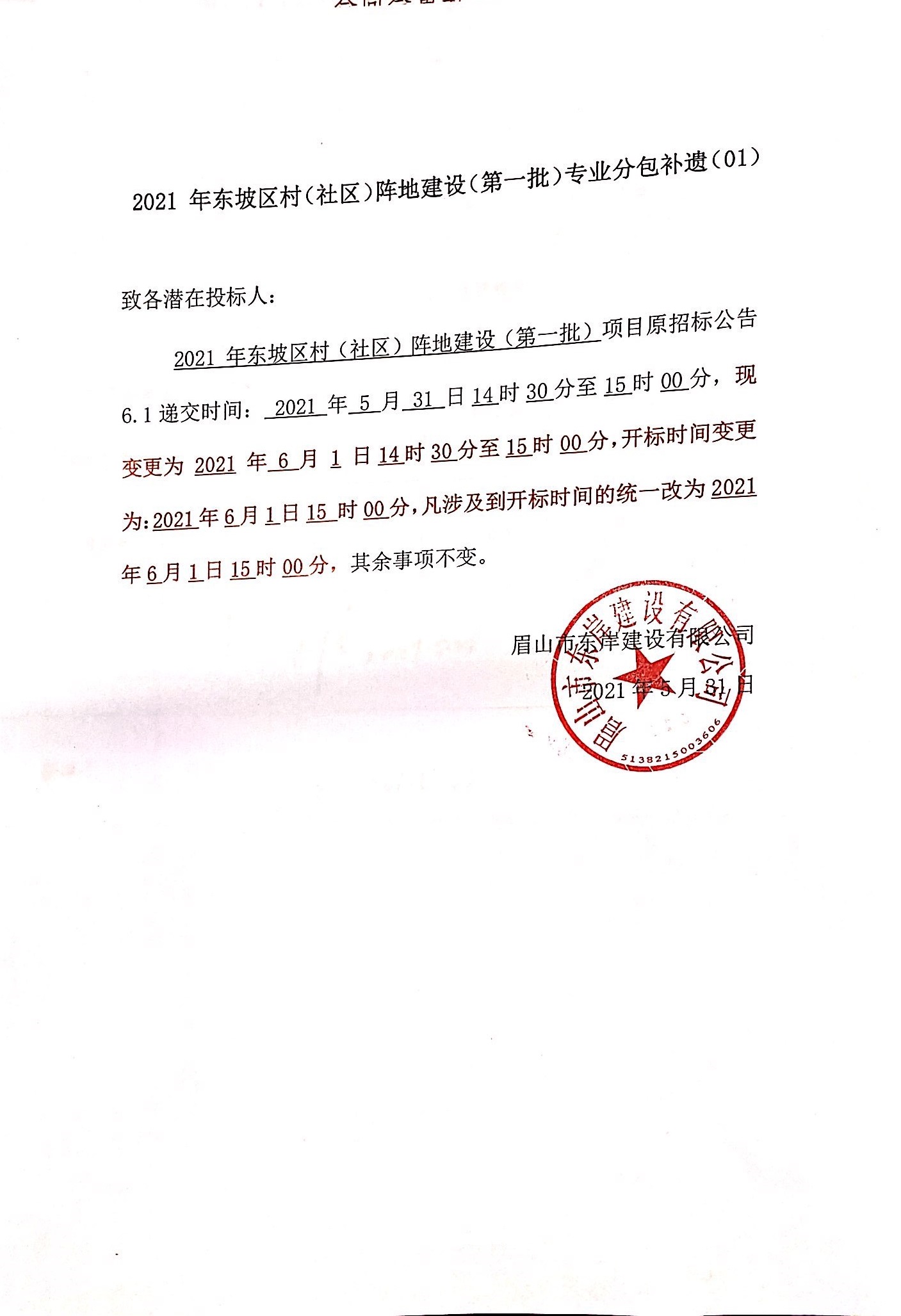 2021 年?yáng)|坡區(qū)村(社區(qū))陣地建設(shè)(第一批)項(xiàng)目原招標(biāo)公告6.1遞交時(shí)間: 2021 年5月31日14時(shí)30分至15時(shí)00分,現(xiàn)變更為2021年 6 月1日14時(shí)30分至15時(shí)00分,開(kāi)標(biāo)時(shí)間變更為:2021年6月1日15時(shí)00分,凡涉及到開(kāi)標(biāo)時(shí)間的統(tǒng)一改為2021年6月1日15時(shí)00分,其余事項(xiàng)不變。