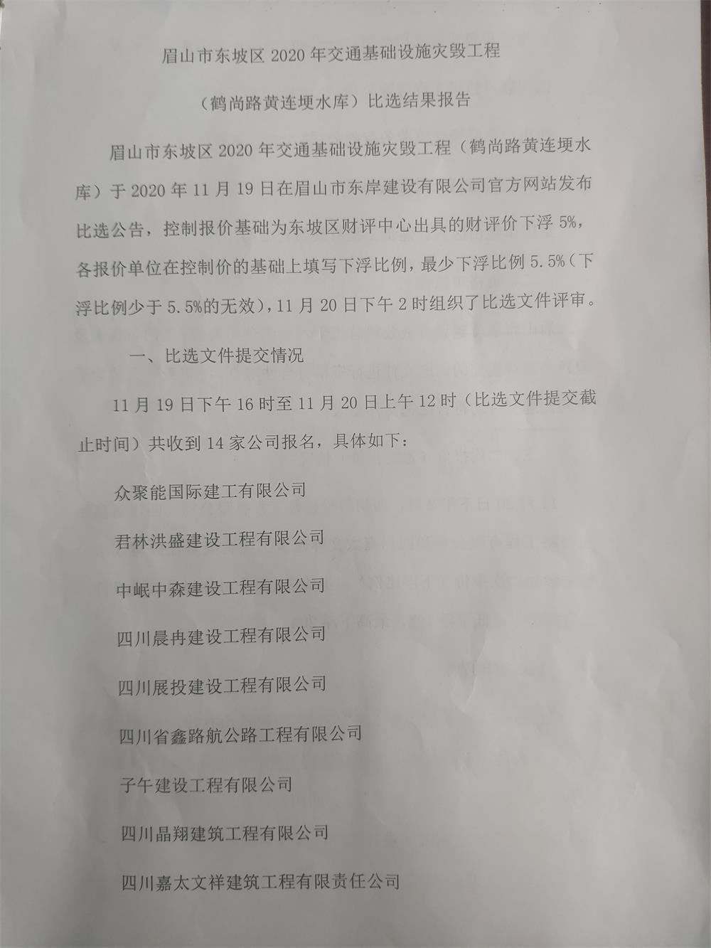 眉山市東坡區(qū)2020年交通基礎設施災毀工程(鶴尚路黃連埂水庫)勞務隊伍比選結果